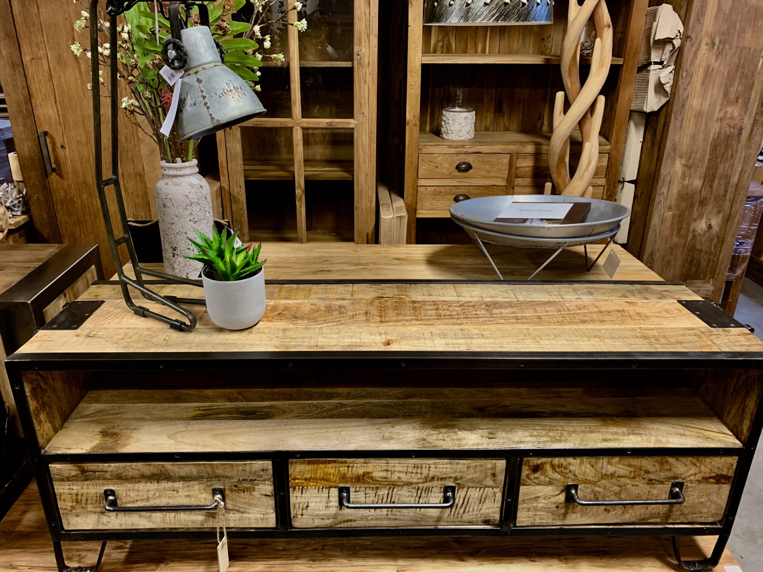 Dit audiomeubel heeft een stoere industriële uitstraling. Deze kast is gemaakt van prachtig mangohout en metaal. Dit tv-meubel is voorzien 3 lades en een groot open vak over de gehele breedte. Een stoer, doch lieflijk audiomeubel.