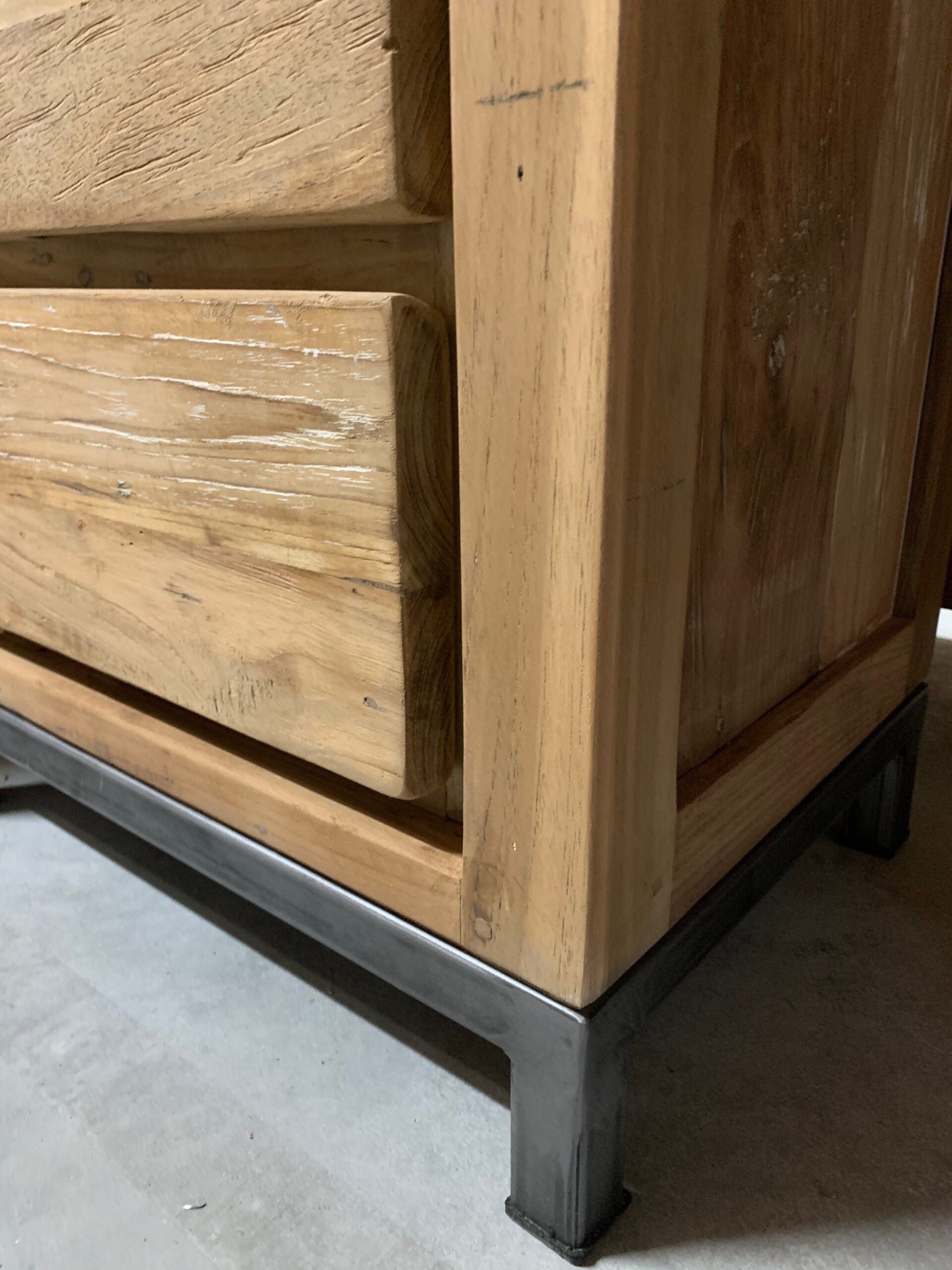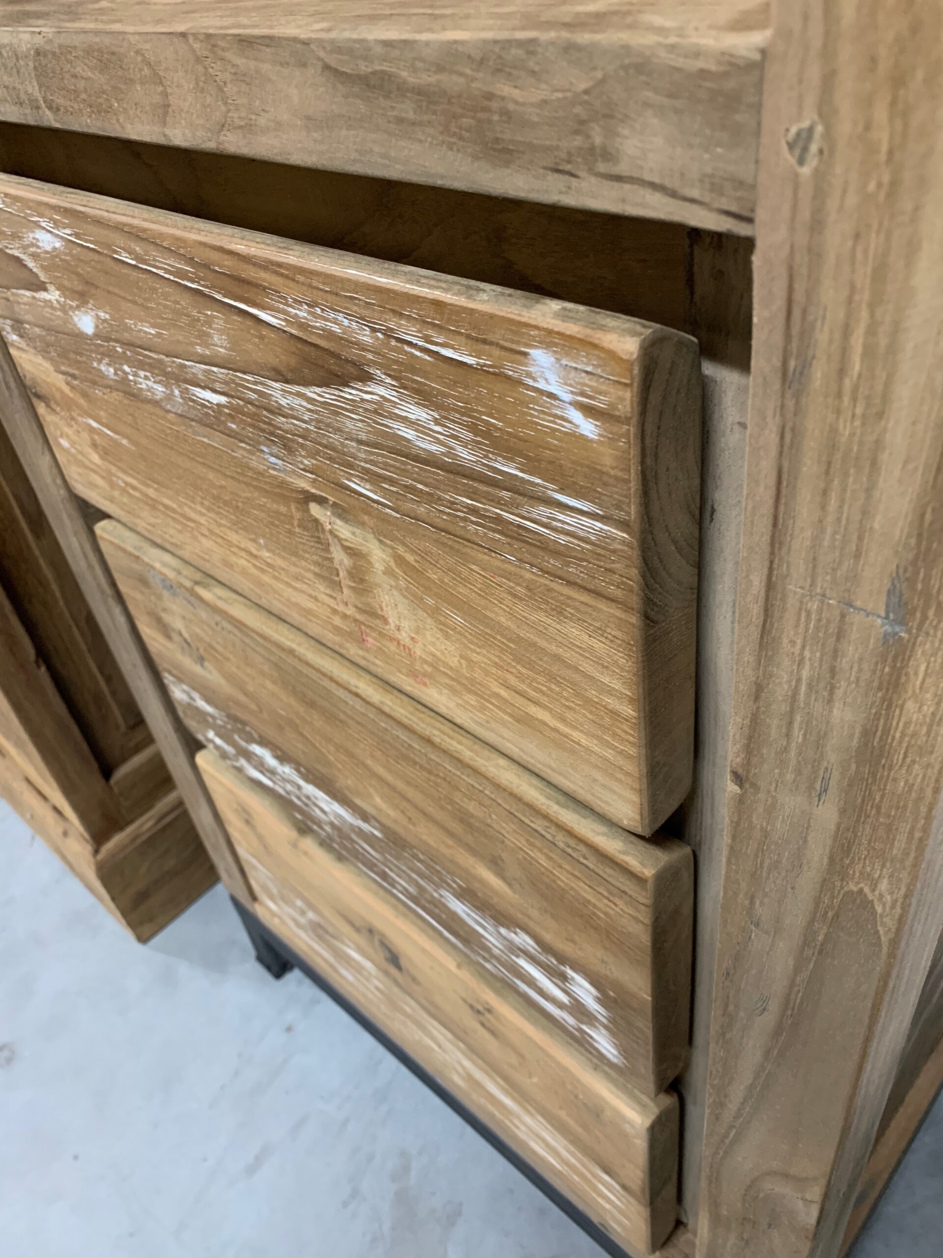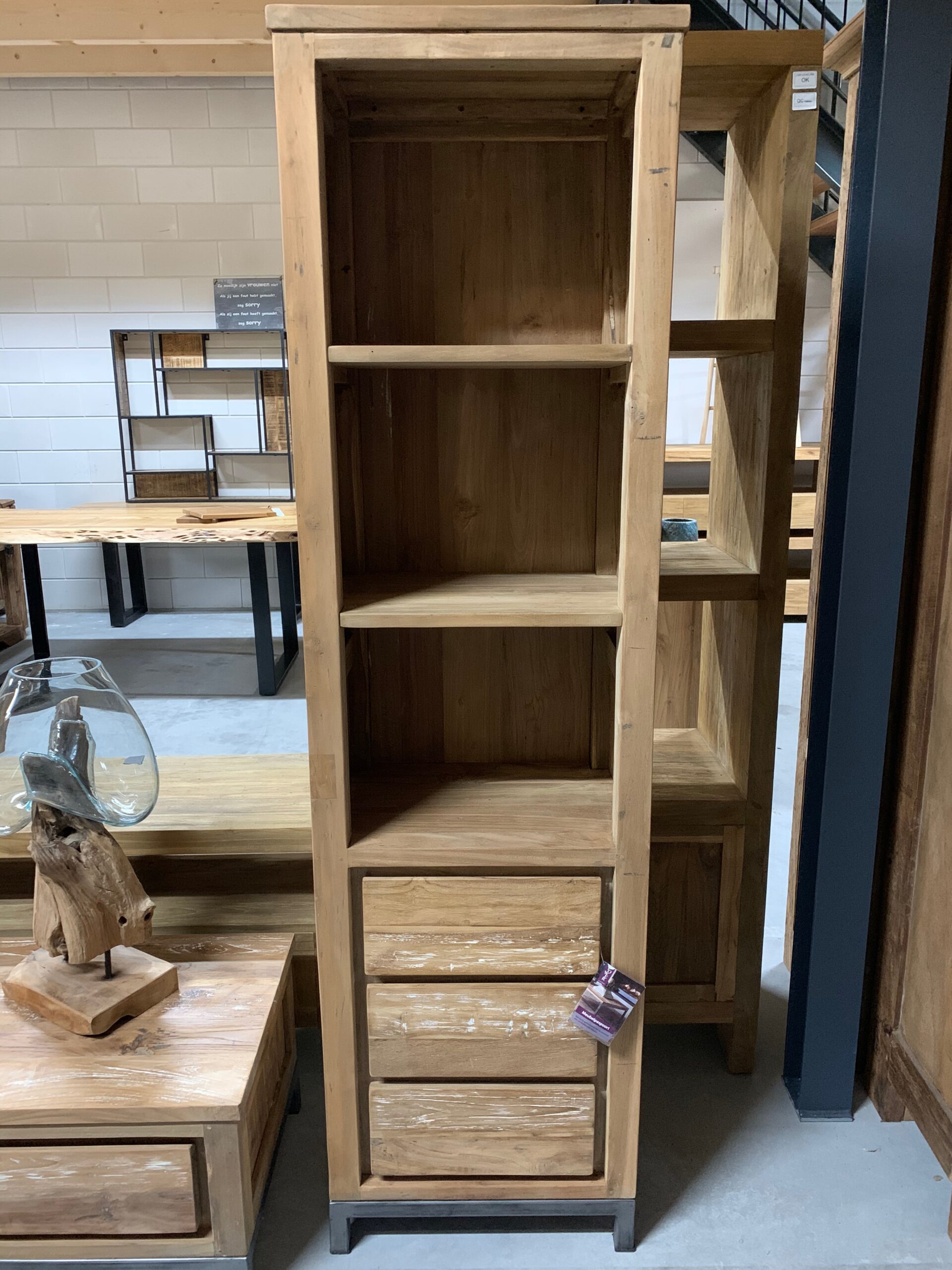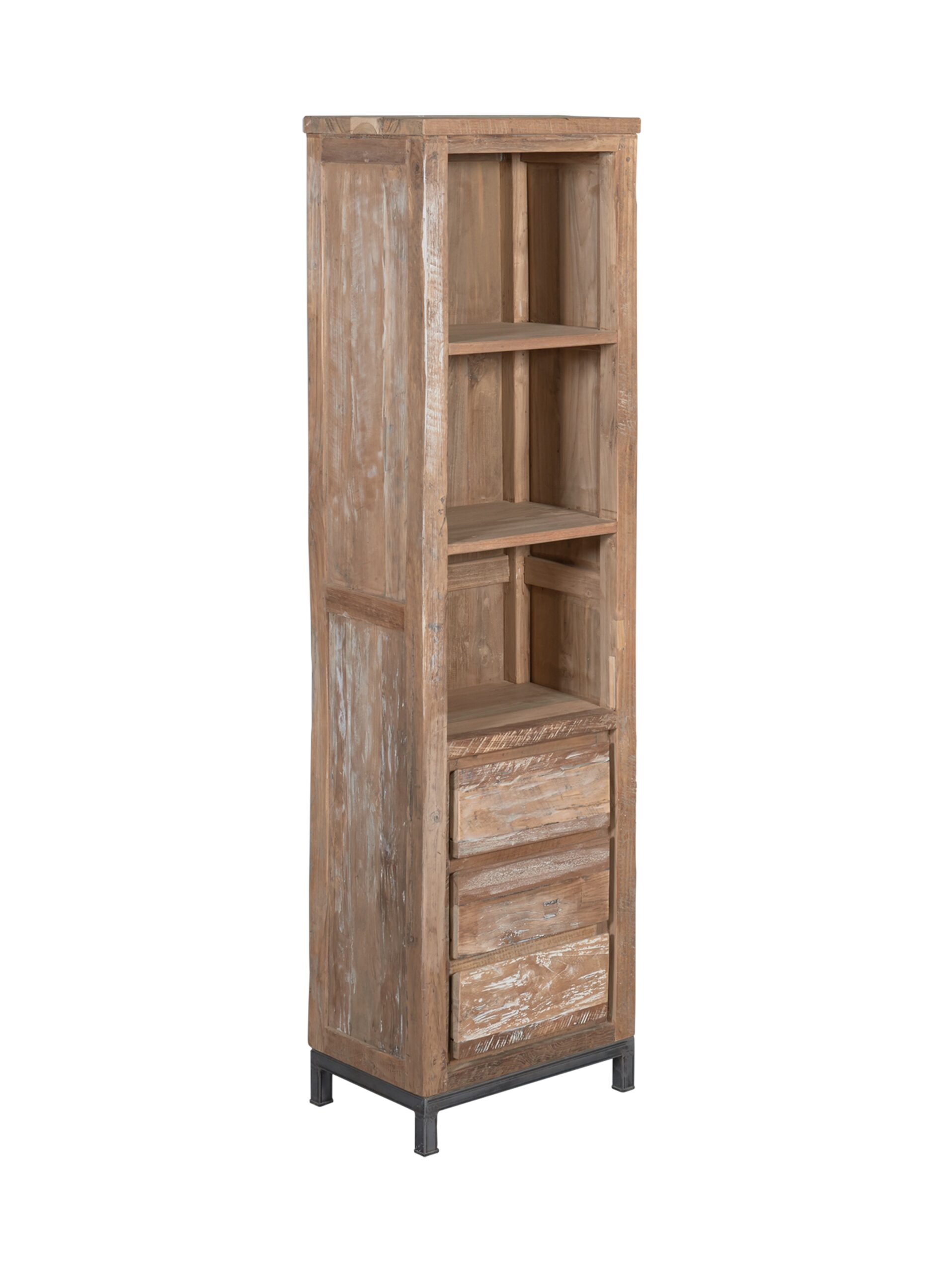 De boekenkast Venetië is gemaakt van gerecycled teakhout waardoor ieder item uniek is. Het meubel is afgewerkt met een lichte white wash en beschikt over mooie grijze metalen poten. Door de combinatie van hout en metaal krijgt deze opbergkast een stoere en industriële look. De boekenkast bevat twee planken en drie greeploze lades waardoor je er genoeg boeken in op kunt bergen. Combineer dit artikel met de overige meubels uit onze collectie Venetië!