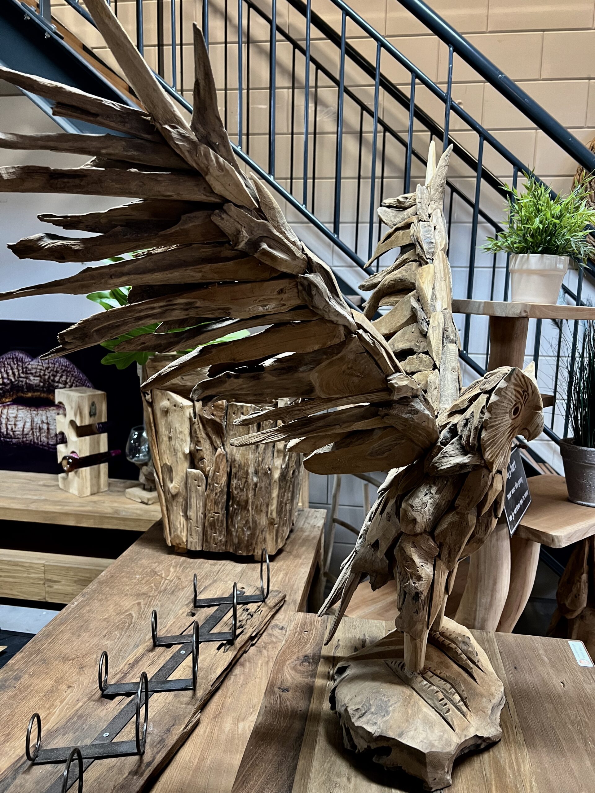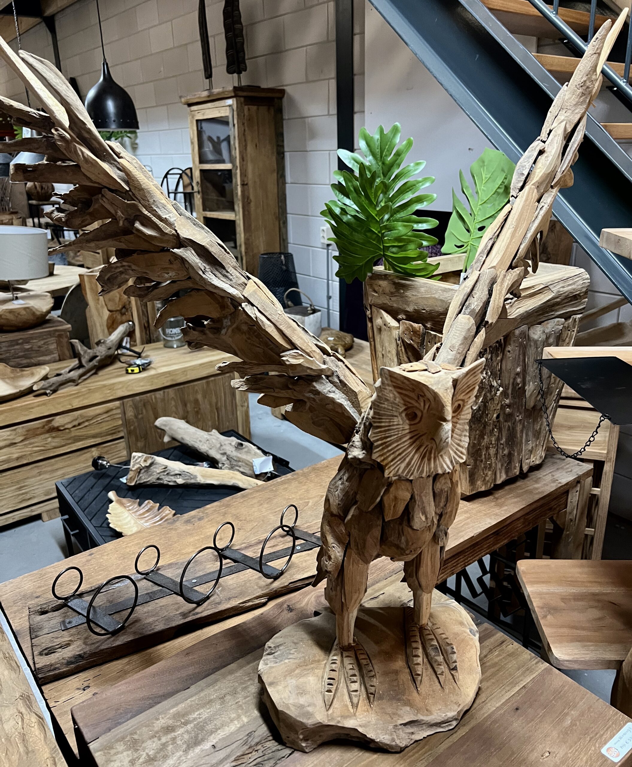 Deze grote uil is van stukken wortelhout/root gemaakt. Met zijn gespreide vleugels laat hij een imposante indruk achter. Vlieg maar binnen!