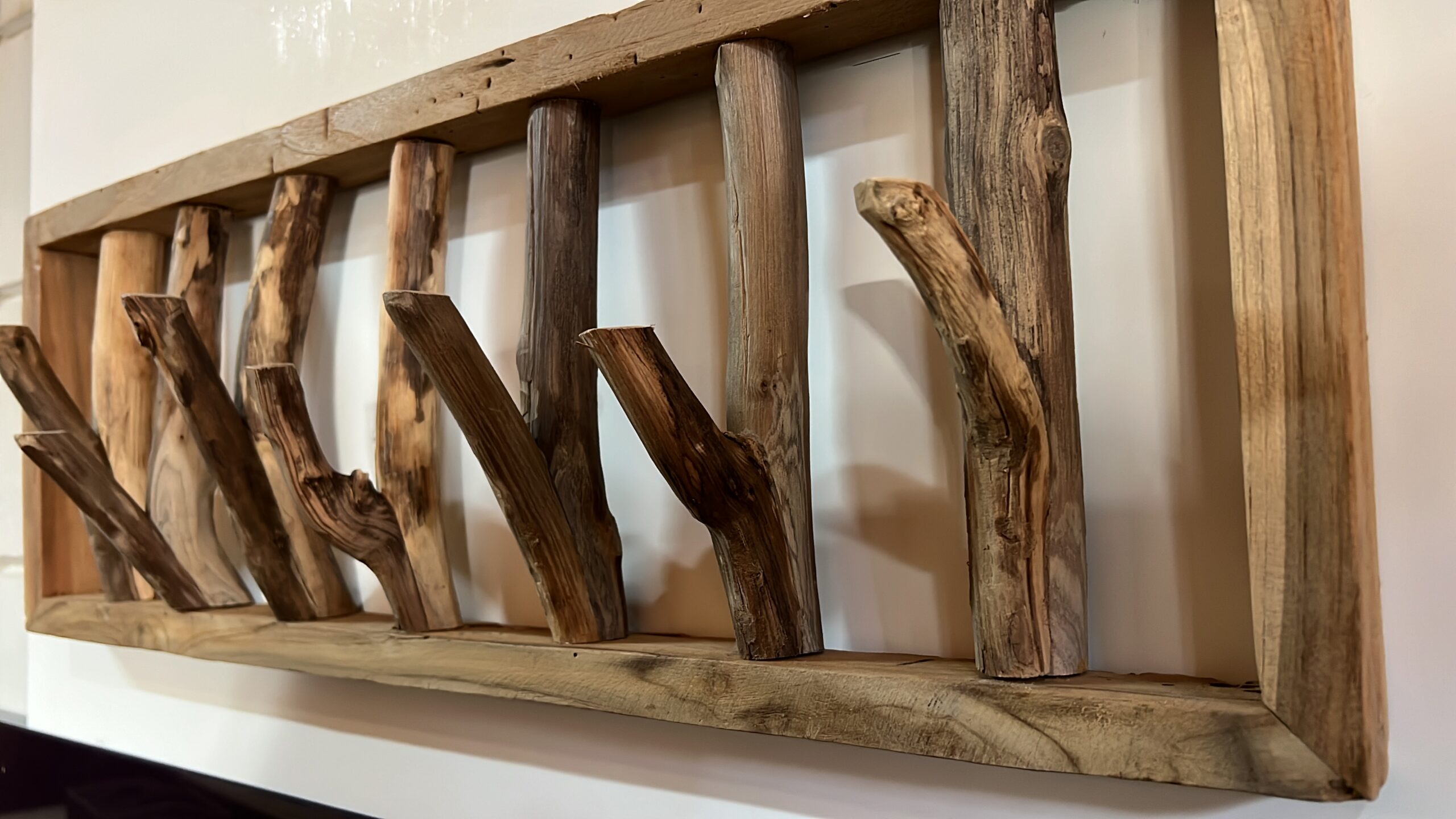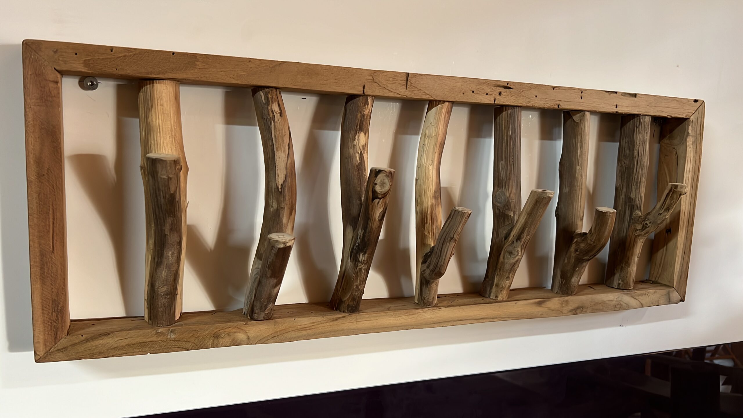 Deze kapstok van teakhout is een sierraad voor uw hal.