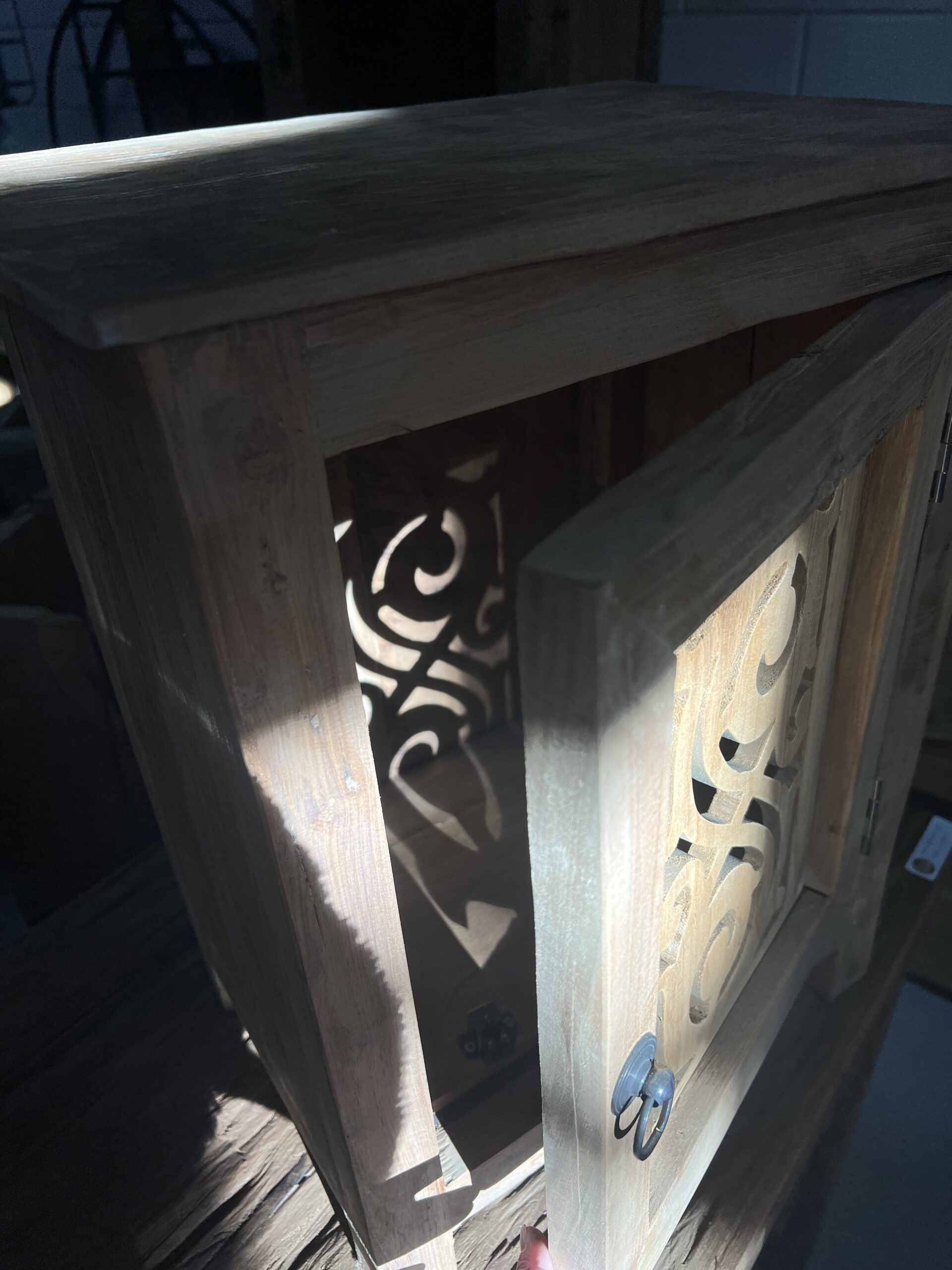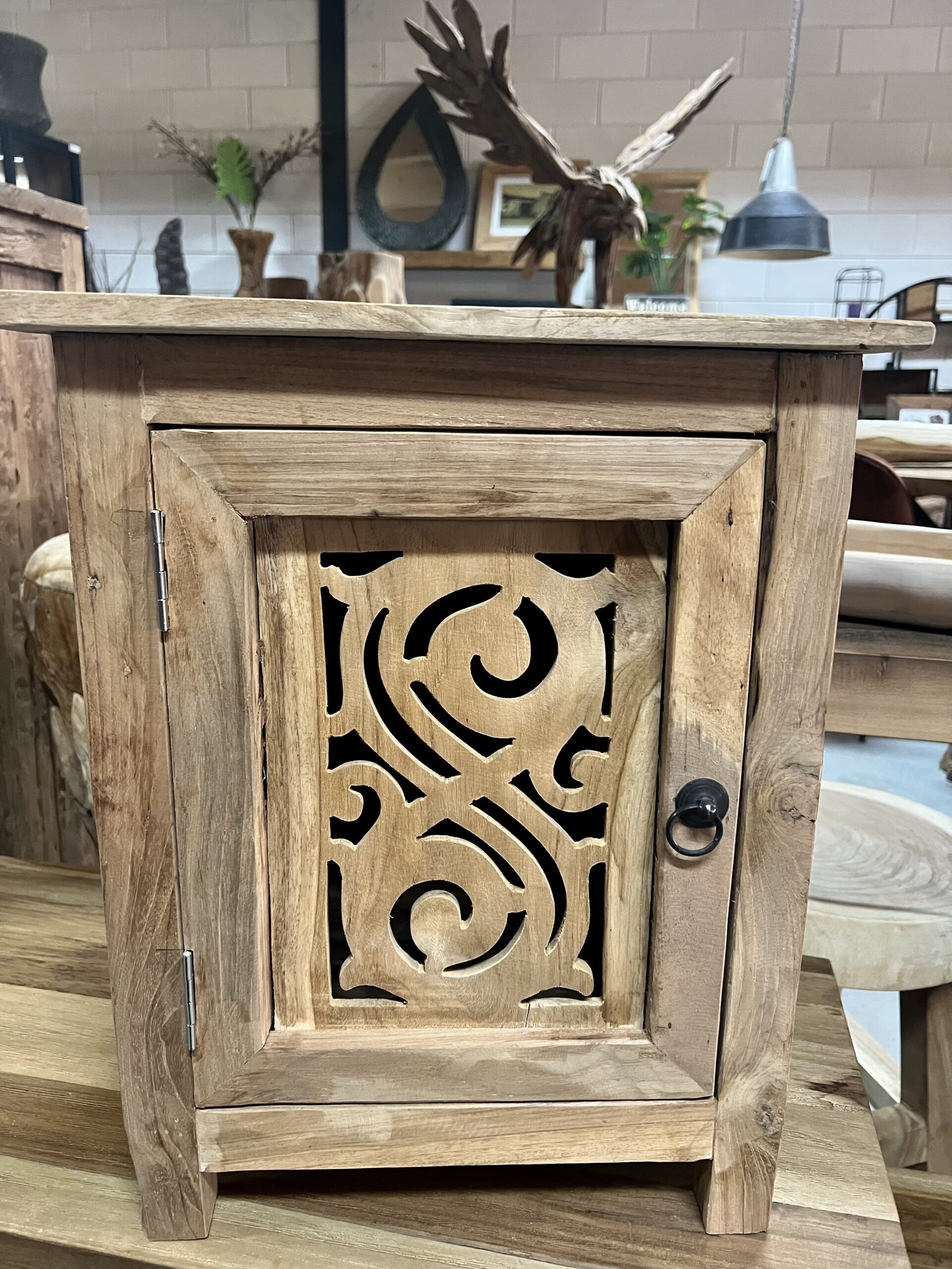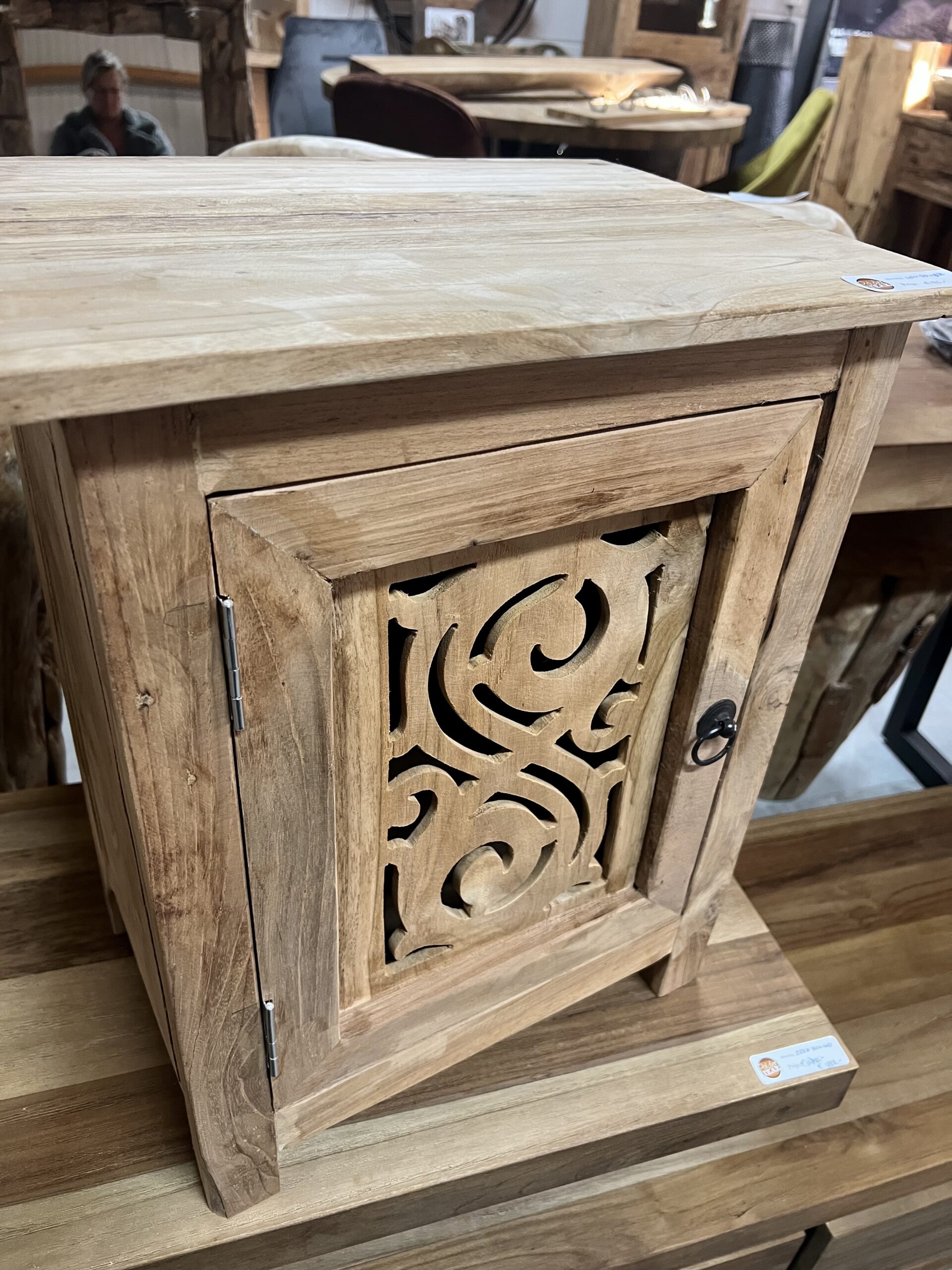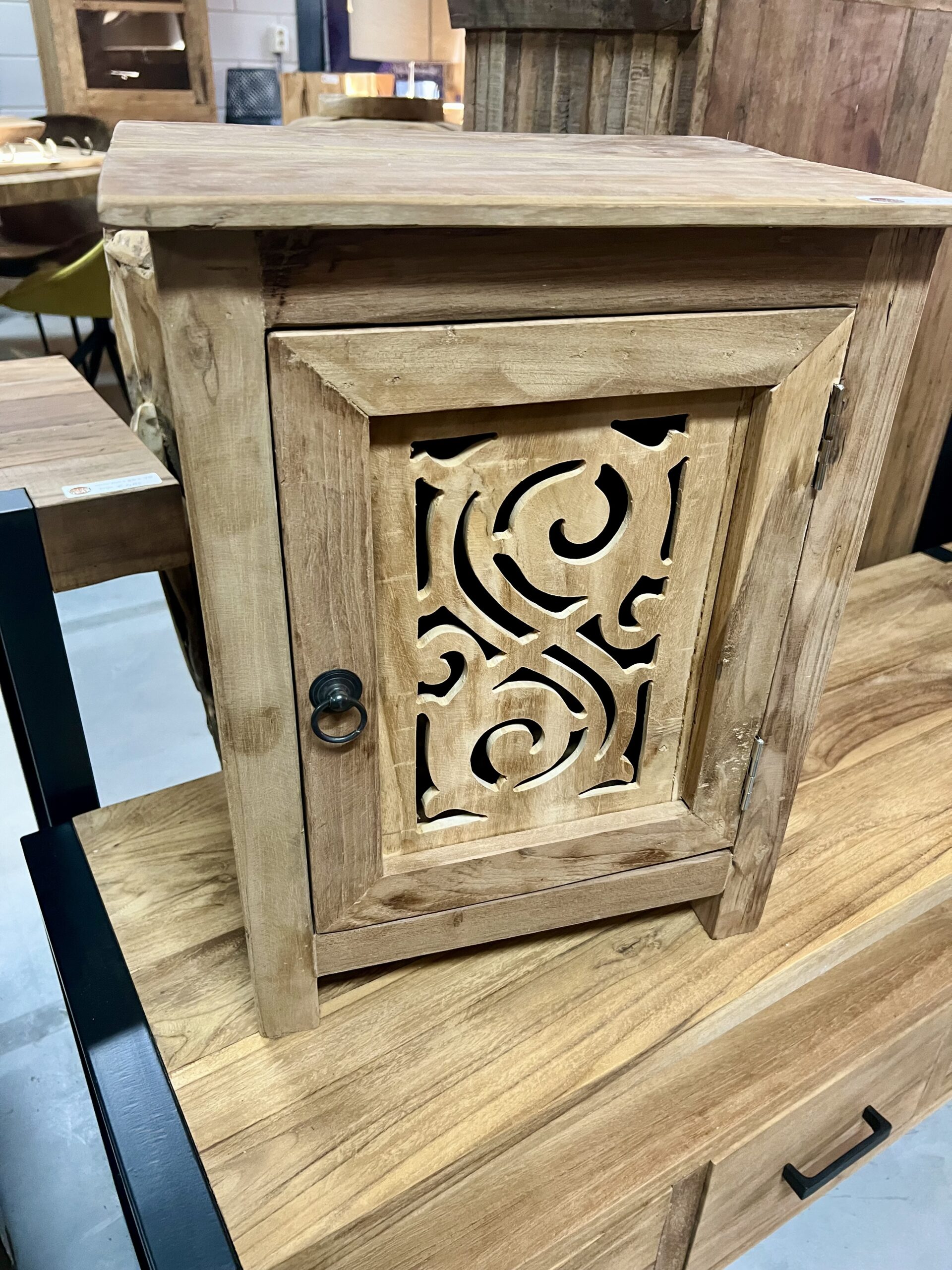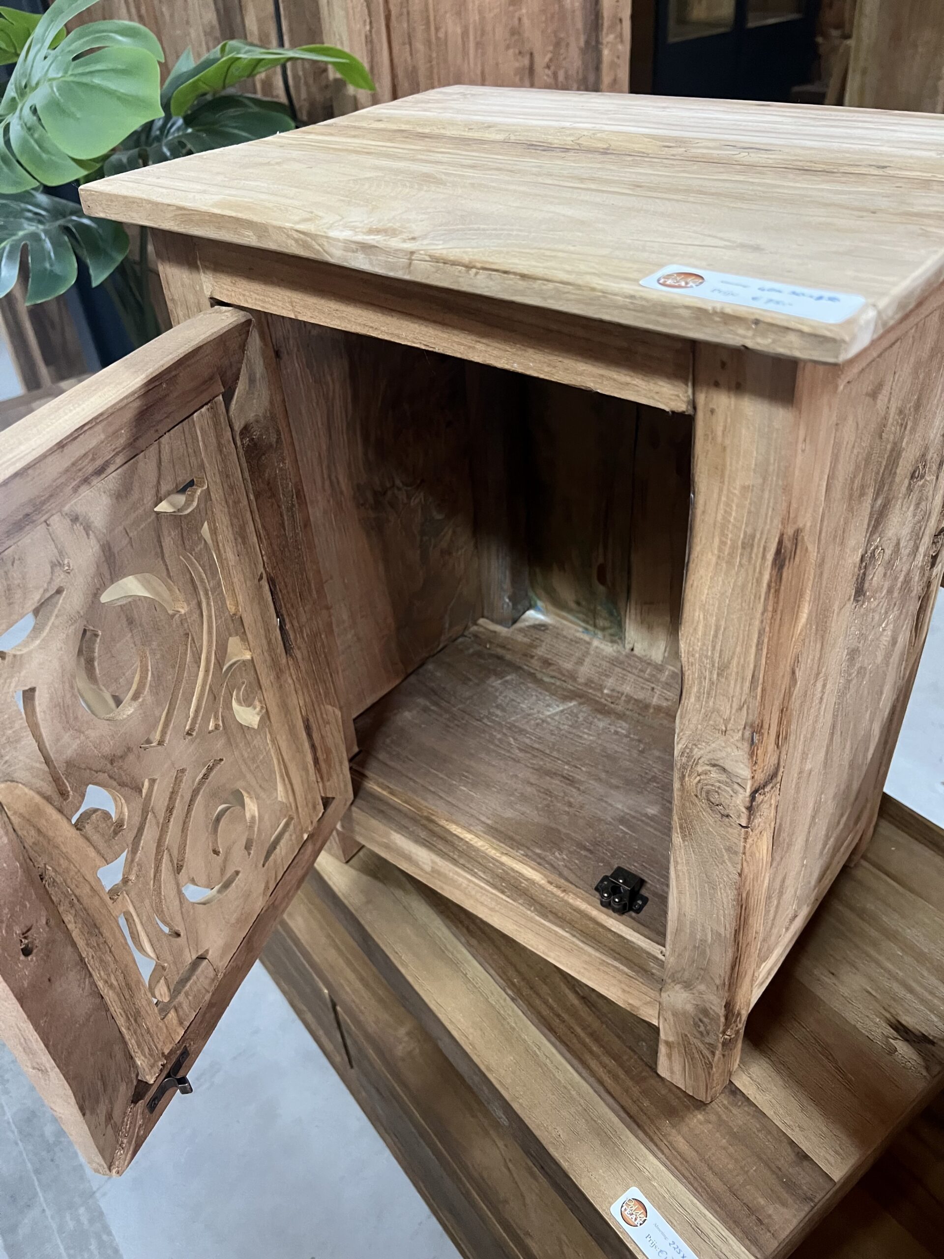 Nachtkastje houtsnijwerk is handgemaakt van gerecycled teakhout en heeft prachtig houtsnijwerk in het deurtje. Het kastje is zowel voor de linkerzijde als de rechterzijde van het bed te bestellen. Dit wil je toch naast je bed hebben?