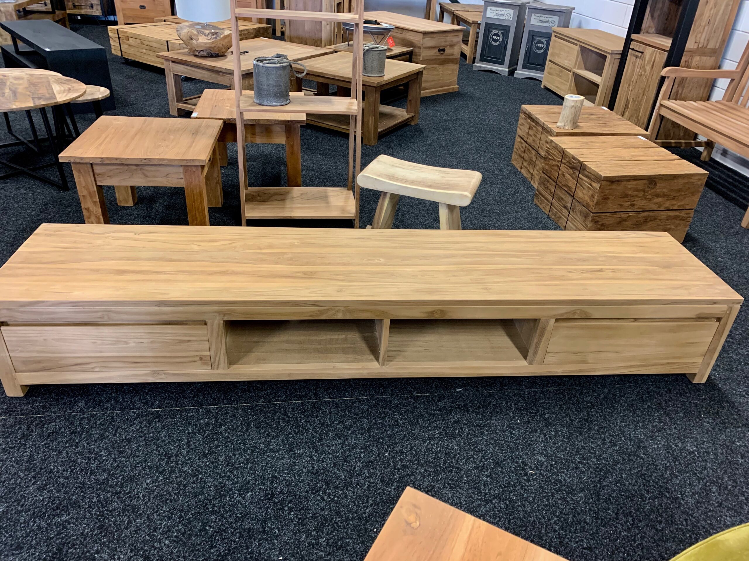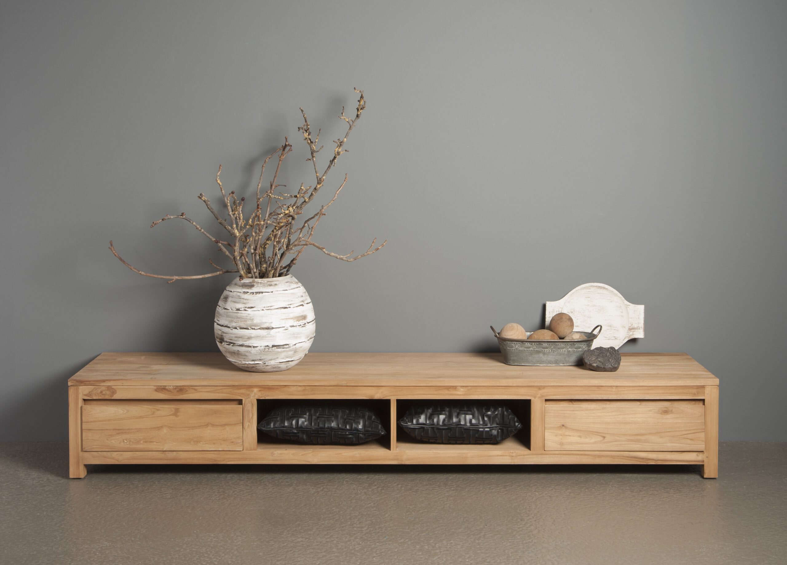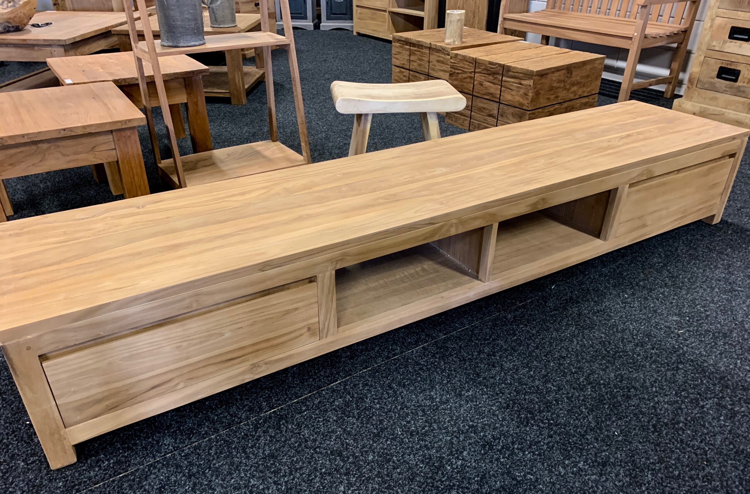 Deze fraaie plasma tv kast 240cm is gemaakt van prachtig onbewerkt teakhout. Door de mooie strakke lijnen en de natuurlijke materialen is dit meubel geschikt voor ieder interieur! Het TV-meubel bevat twee greeploze lades en twee open vakken. Erg handig om jouw spullen in op te bergen en apparatuur in de open vakken te plaatsen.