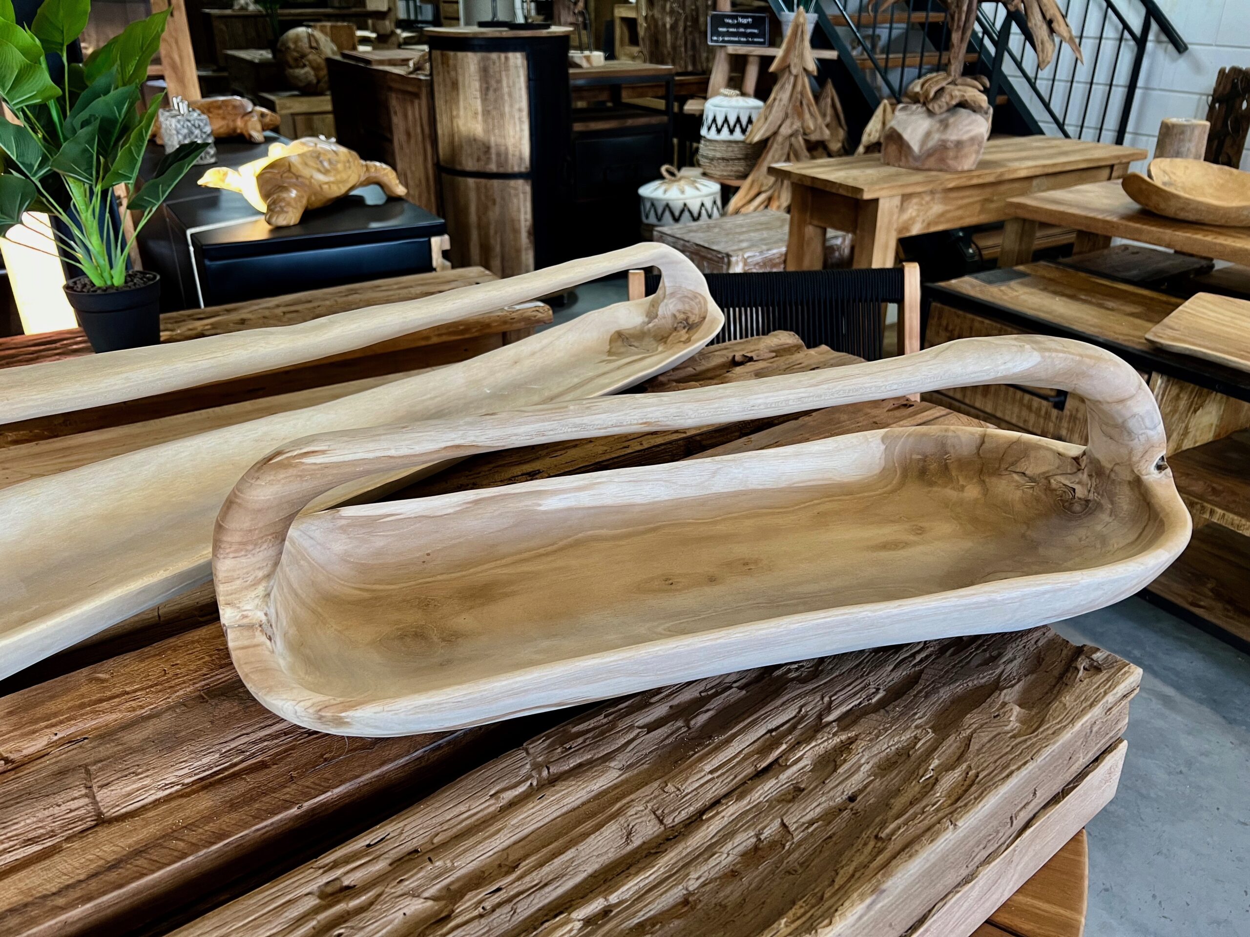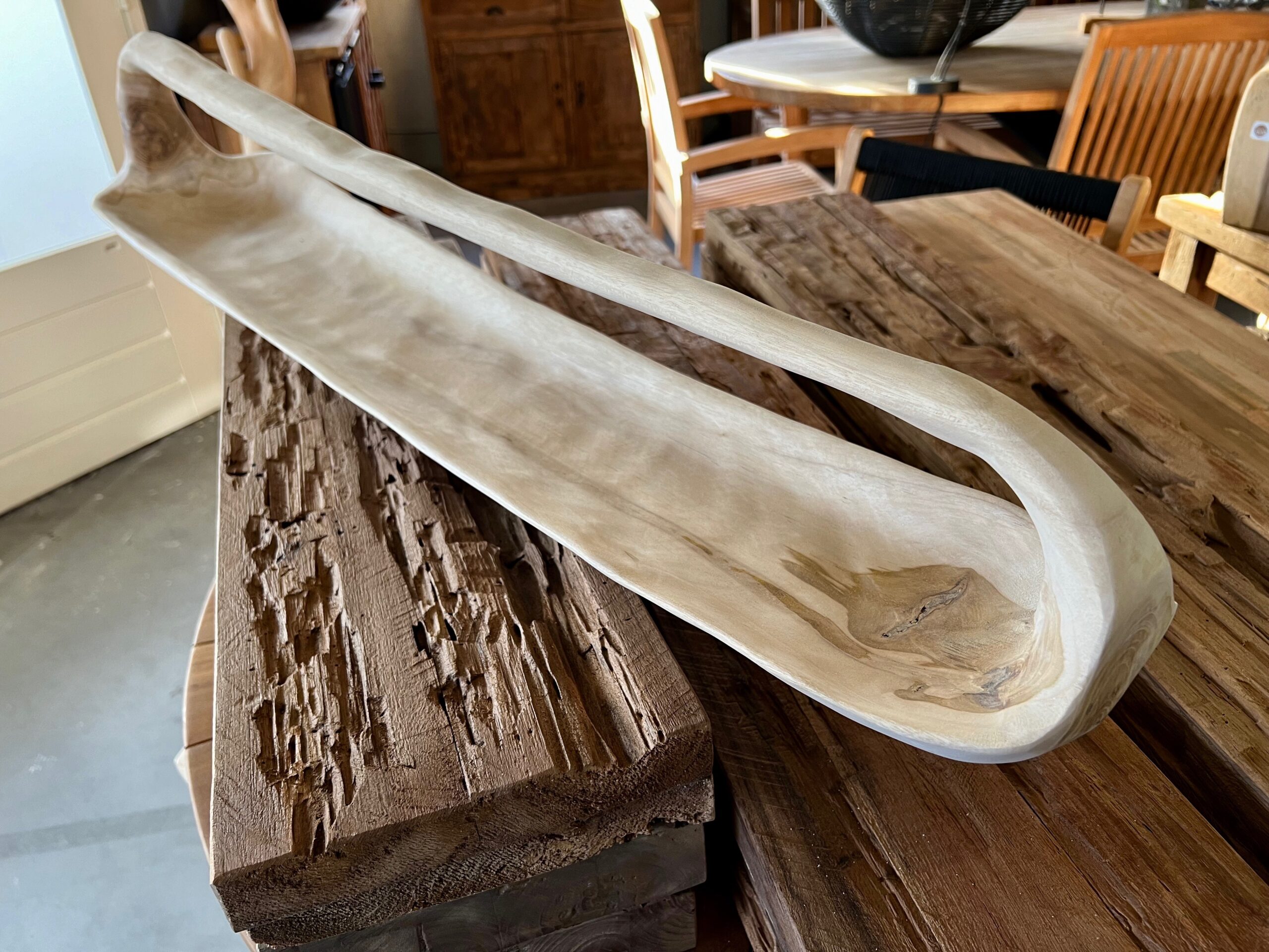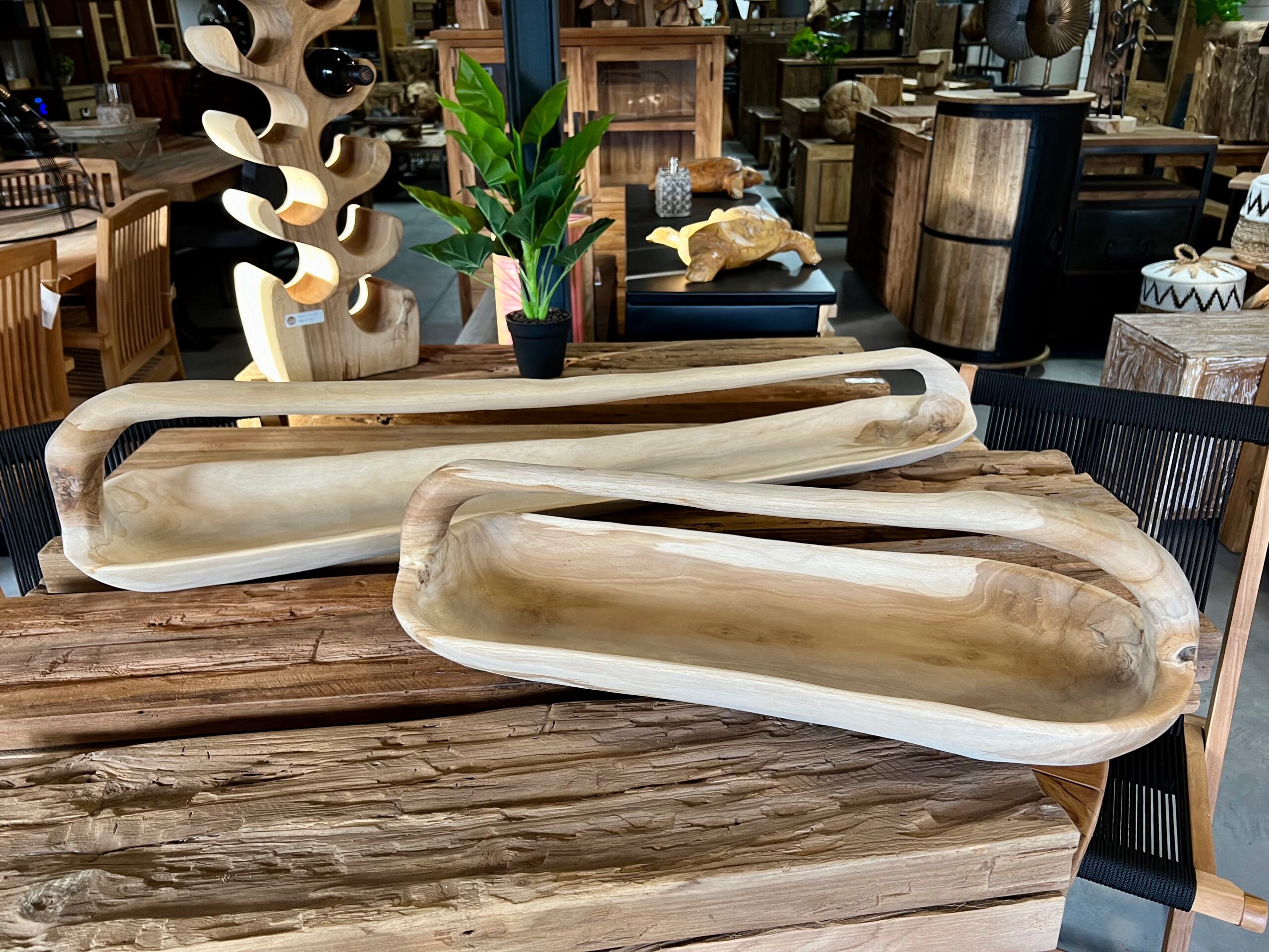 Een schaal van massief wortelhout met een mooie gladde binnenzijde en een grappig handvat.