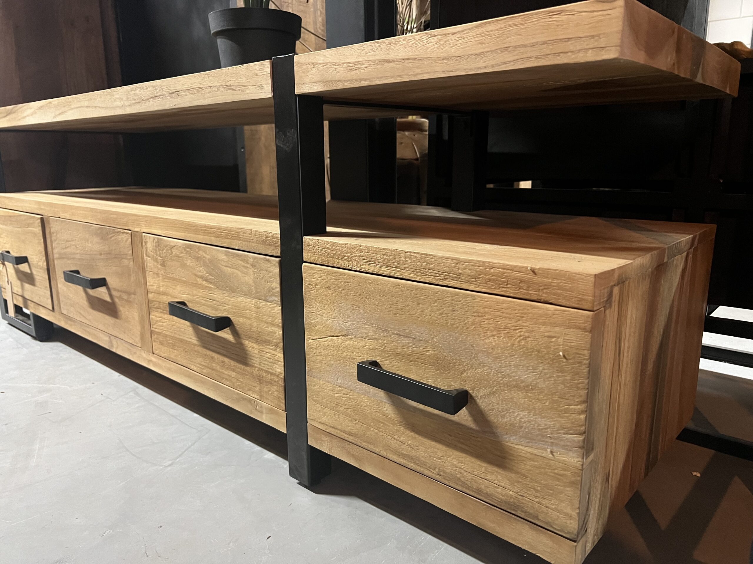 Het TV-meubel 150 cm is een eigentijds meubel dat op ambachtelijke wijze vervaardigd wordt van gerecycled teakhout. Het TV-meubel bevat vier lades, erg handig om allerlei spullen in op te bergen. Dit stoere en industriële meubel heeft dikke massieve teakhouten bladen en is qua design net even iets anders dan andere TV-meubels!