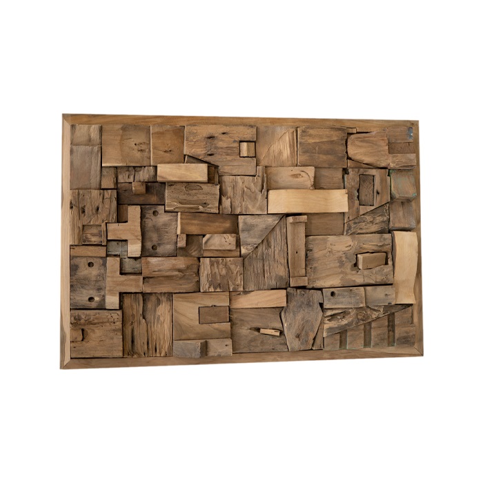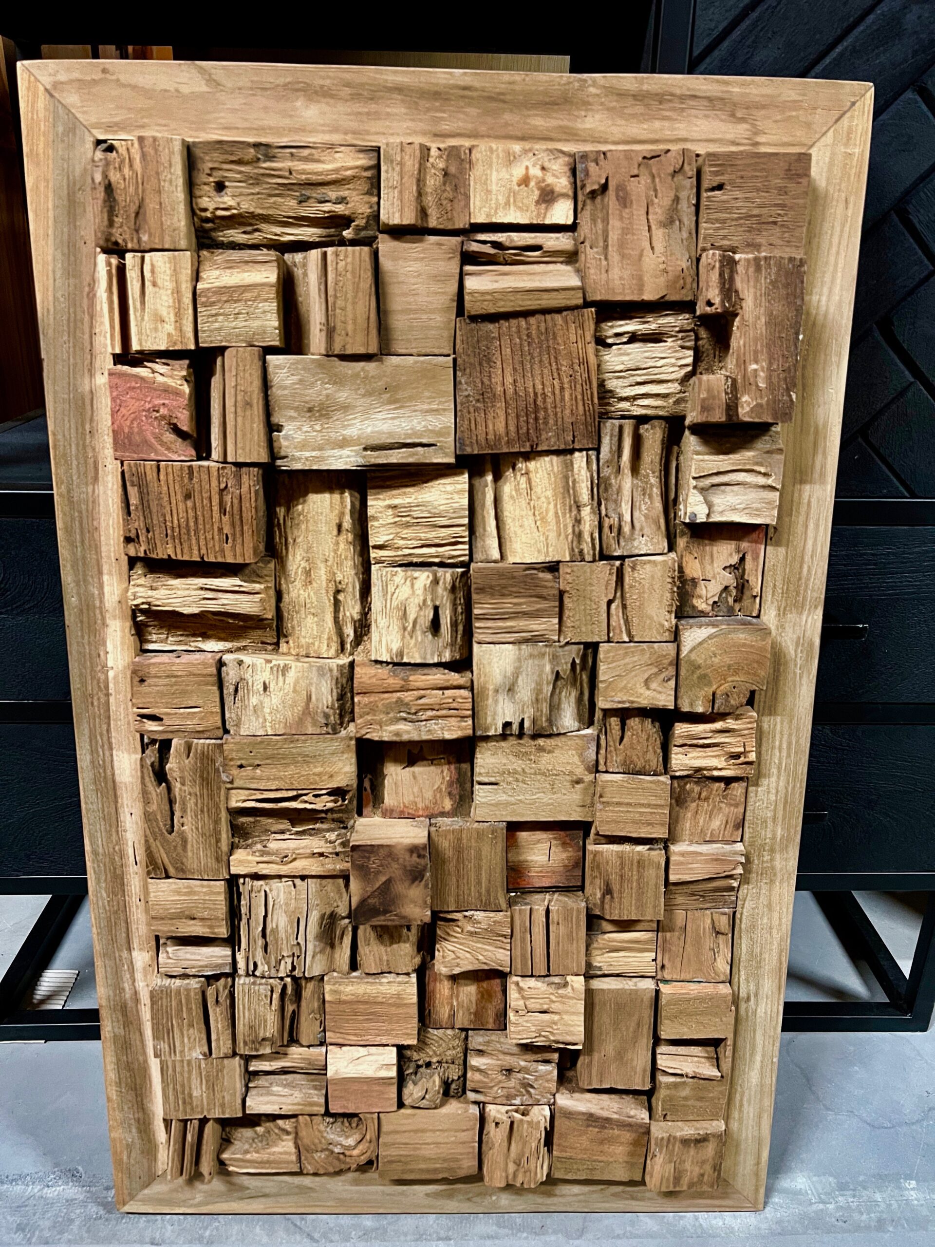 Als je op zoek bent naar een bijzonder stuk om de wand mee te decoreren, en eens iets anders wil dan een foto of schilderij, is deze wanddecoratie rustiek vast iets voor jou! Dit aparte werk is gemaakt van teakhout en geeft jouw huis meteen een rustieke en knusse sfeer. De buitenste rand heeft de vorm van een lijst, binnenin vind je teakhouten stammen die naar voren uitsteken. Ook verkrijgbaar in een andere afmetingen.